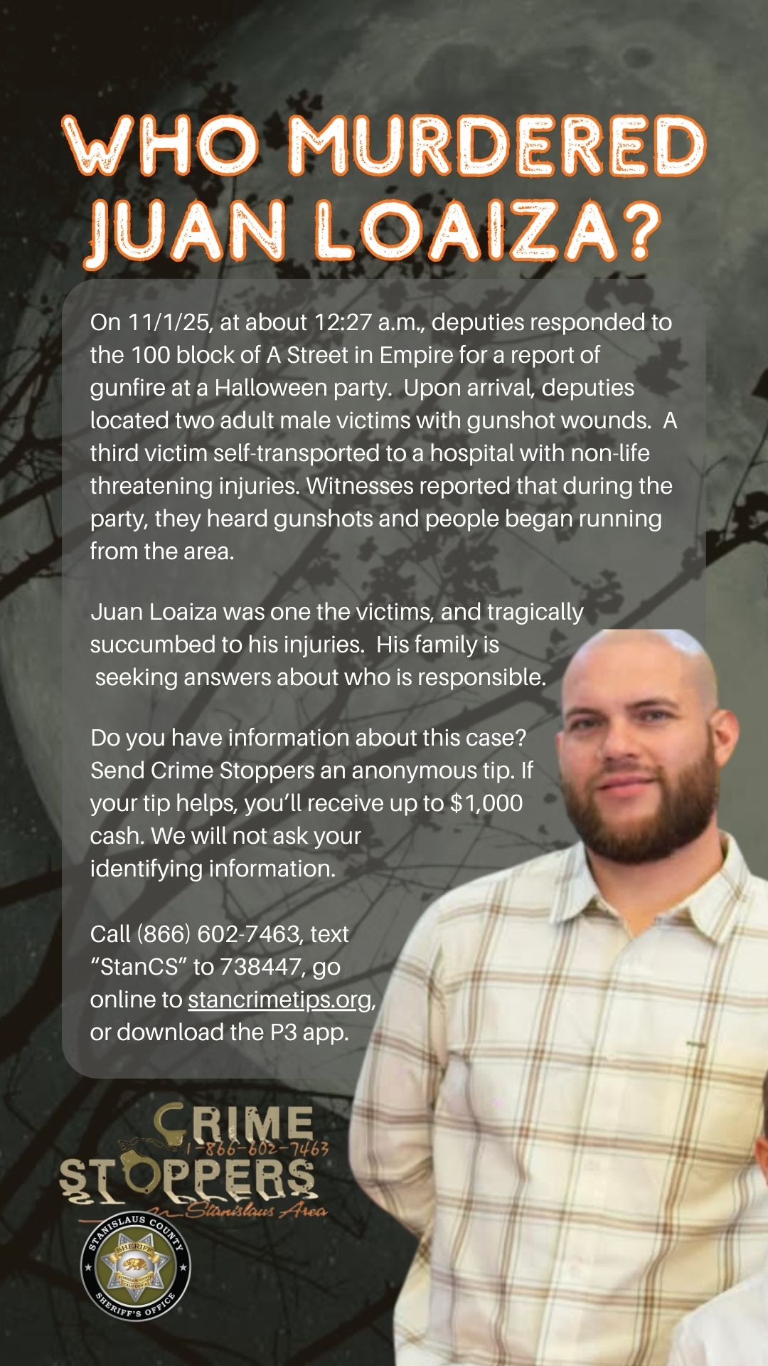 On November 1, 2025, at about 12:27 a.m., deputies with the Stanislaus County Sheriff’s Office responded to the 100 block of A Street in Empire for a report of gunfire at a Halloween party. While enroute, dispatch confirmed there were multiple gunshot victims.
